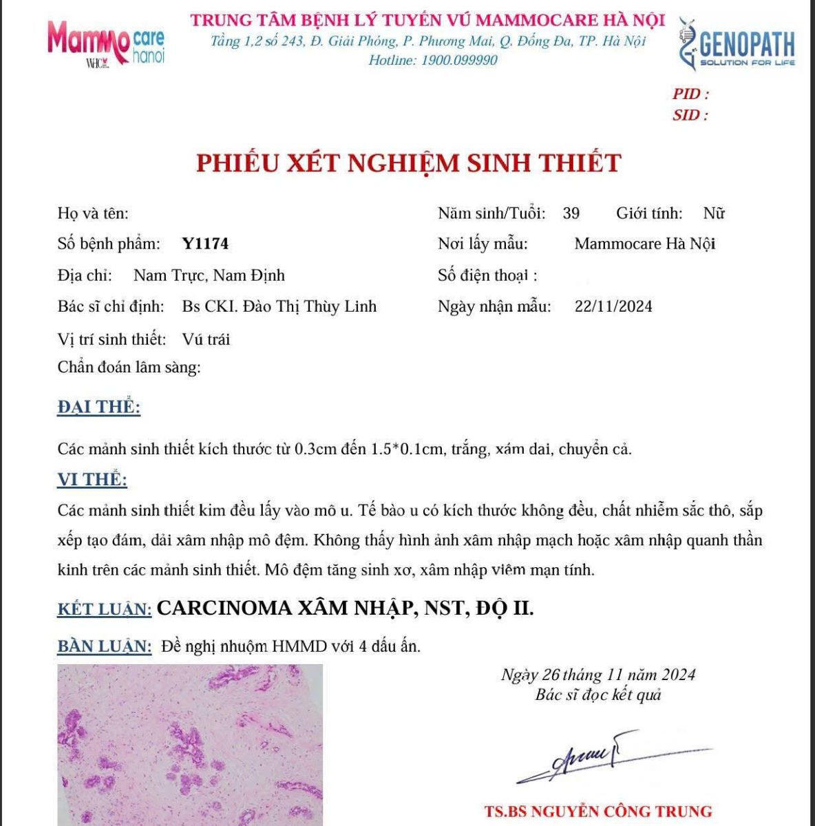 Người thứ ba, 42 tuổi, kết quả còn đáng lo hơn khi bác sĩ mô bệnh học ghi rõ: "Ung thư biểu mô xâm nhập, có hình ảnh xâm nhập quanh thần kinh." Điều này có nghĩa là tế bào ung thư đã có dấu hiệu lan ra ngoài mô vú, và quá trình điều trị sẽ phức tạp hơn.