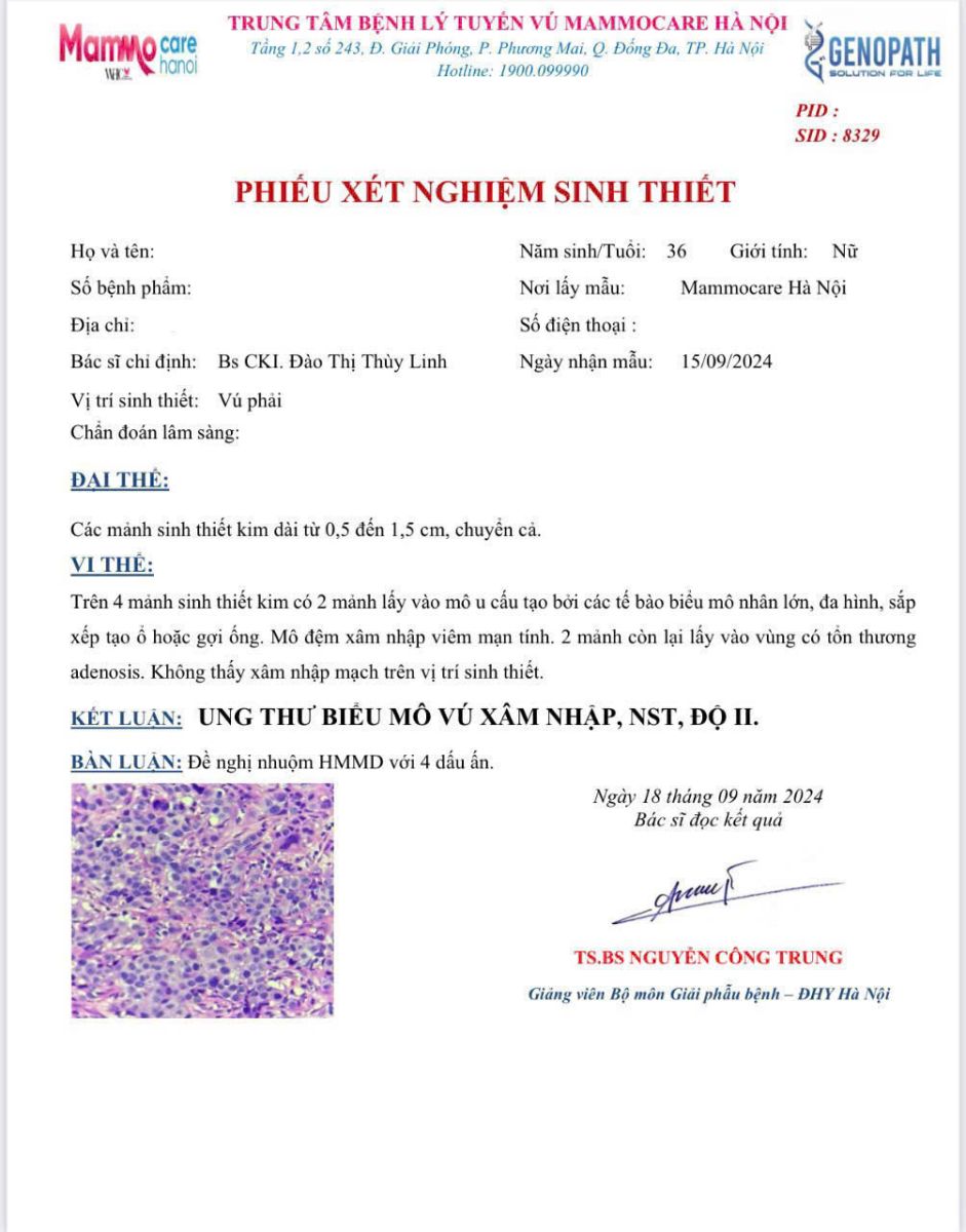 Kết quả sinh thiết xác nhận: Chị N đã mắc ung thư vú xâm nhập. Điều đáng nói là trước đó, chị không có triệu chứng bất thường nào. Nếu không thực hiện kiểm tra, khối u có thể tiếp tục phát triển âm thầm và chỉ được phát hiện ở giai đoạn muộn hơn, khi việc điều trị sẽ khó khăn hơn rất nhiều.
